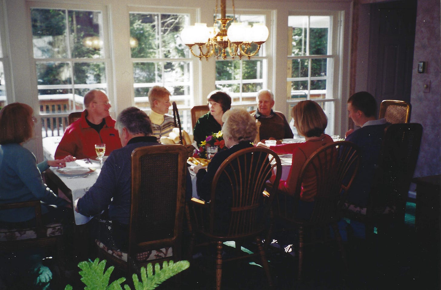 I love Thanksgiving traditions. As young lovers, my wife and I had to eat twice that day to avoid hurting the feelings of one set of parents. I was so shocked to watch my young girlfriend eat so many mashed potatoes. I still see Sue’s Dad smoking his cigarette at dinner as we finished our pie. Over the years, we have evolved our menu to offer salmon, ham, turkey, and pie. Lots of pie. For our vegan son, we cover his needs. I got close to chef status serving delicious, tender turkey. Not an easy task. I still have so much to learn. One of our four-generation celebrations filled our tiny 120-year-old 1,750 sq ft cottage on the edge of Lake Erie in Bay Village. My Dad and Sue’s Mom were still with us. We found this Italian chandelier that matched the time frame of the cottage, when gas and electricity were not that reliable. The dining room featured the nine triple-hung windows.